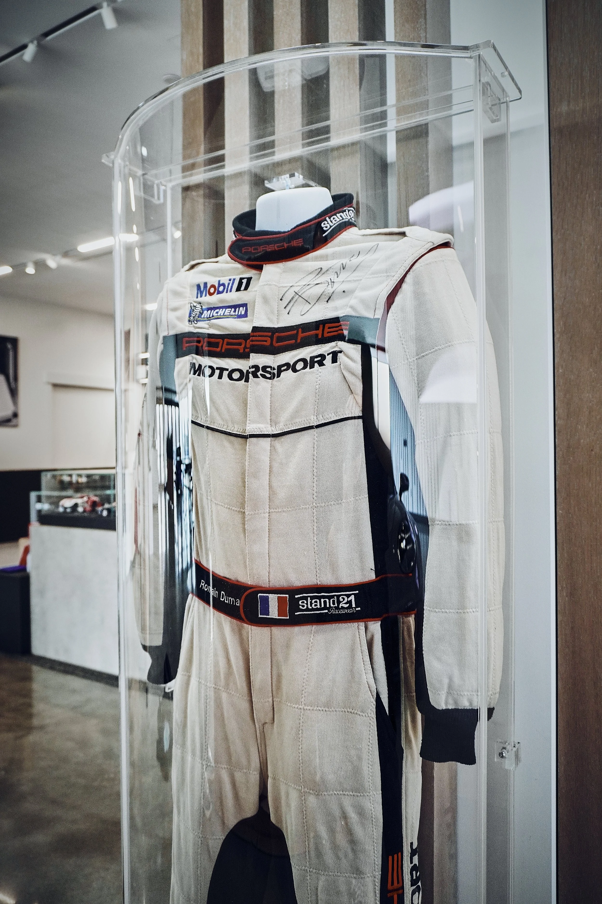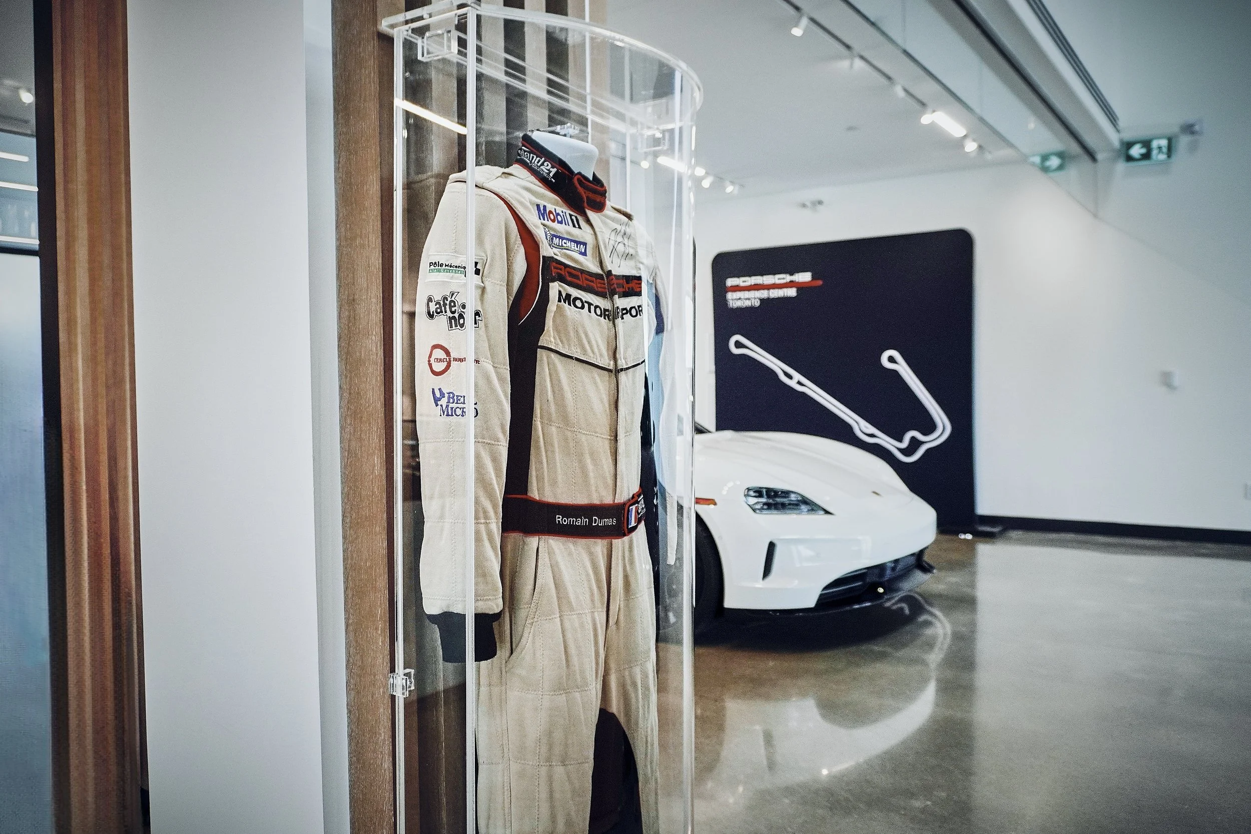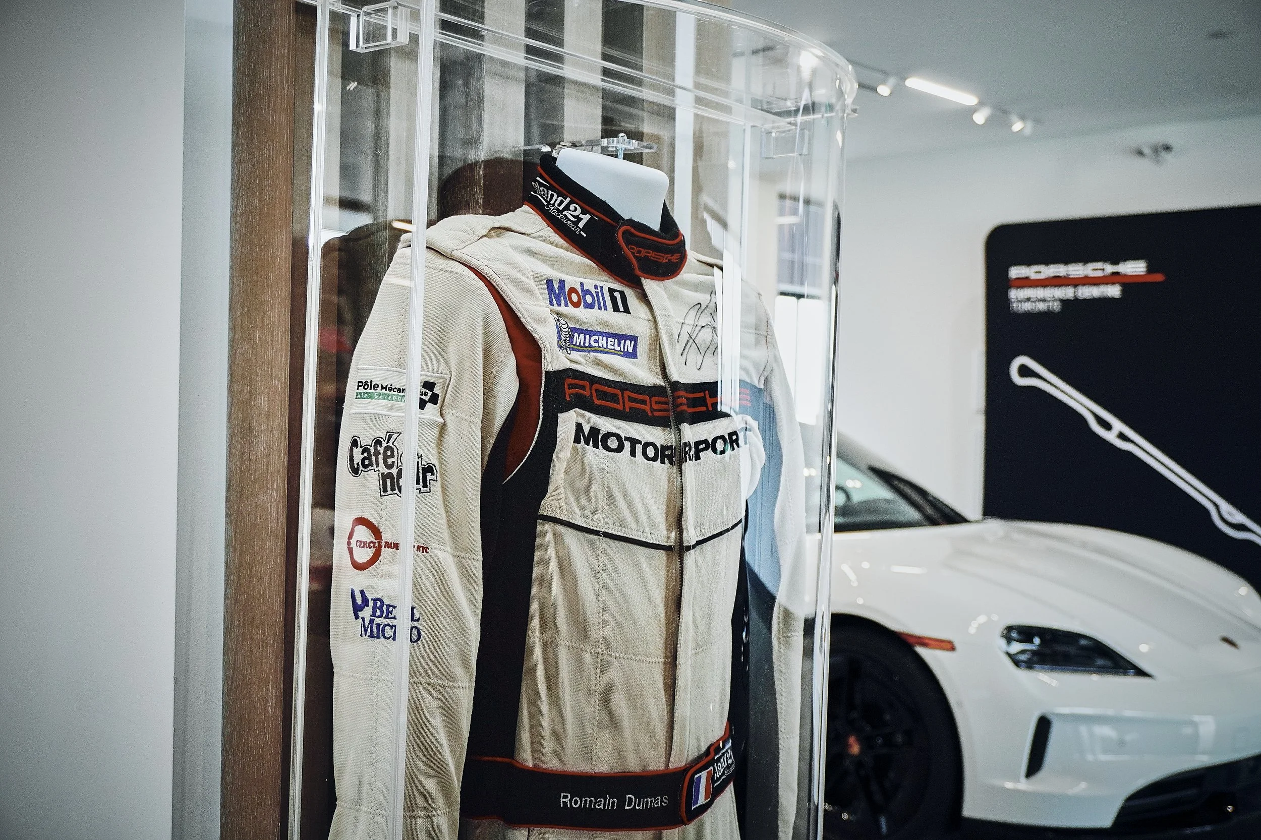 Displayed at the Porsche Experience Centre Toronto, this suit from Romain Dumas offers visitors a direct connection to a well-known endurance racing name. Presented as part of a timed exhibit, the suit allows visitors to experience the physical reality of professional motorsports, from driver to safety manufacturer.